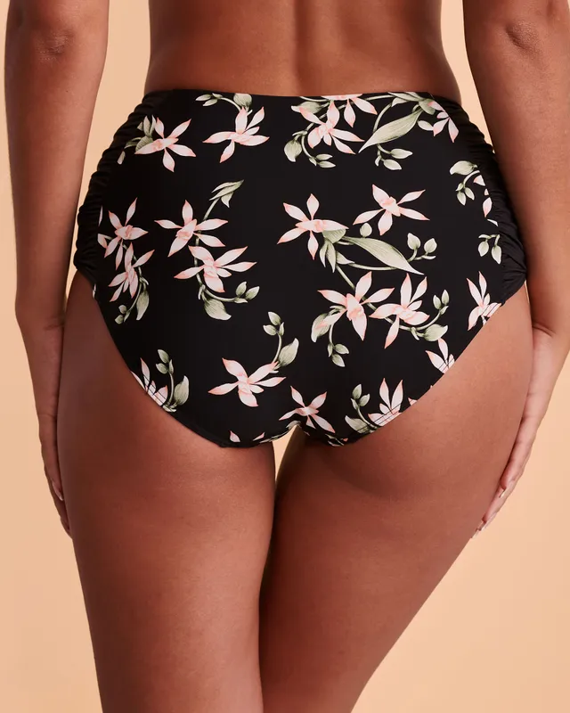 New style! High waist bikini bottom with shirred sides and allover floral print.
