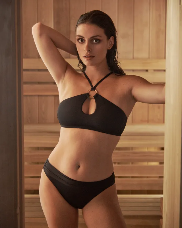 Elevate your swimwear game with this high-neck bikini top, combining fashion-forward style and comfort for a chic, sophisticated beach look.